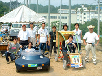 2003年もシステム工学研究室の夏は熱かった! 2002年に続き、日本で唯一の一般公道を利用した電気自動車ラリー「四国電気自動車ラリー」に参戦したからです。今回で6回目となるこの大会は8月23、24日の2日間、お遍路みちの起点にあたる徳島県鳴門工業短期大学を中心に周辺の9つの名所を訪れるラリーコースで開催されました。私たちの「チーム・ヒラソル」は工学部・電子情報工学科・システム工学研究室(松井幹彦教授)の学生有志とベンチャー企業2社(マイウェイ技研、エービーテック)とで構成される産学連携のチームです。参戦したのは2台のEV。1台は、最高時速70kmでの走行が可能な「ヒラソル2号」でこれはブラシレスDCモータ、ドライバ、シャーシ、ボディー全てをオリジナルに制作したもの。もう1台は、人力アシストハイブリッド・パイプEV「よしず号」。こちらは最高時速が30kmのゆったりとした走りです。共にミニカーとしてのナンバーを取得して一般公道を走ることができるものです。